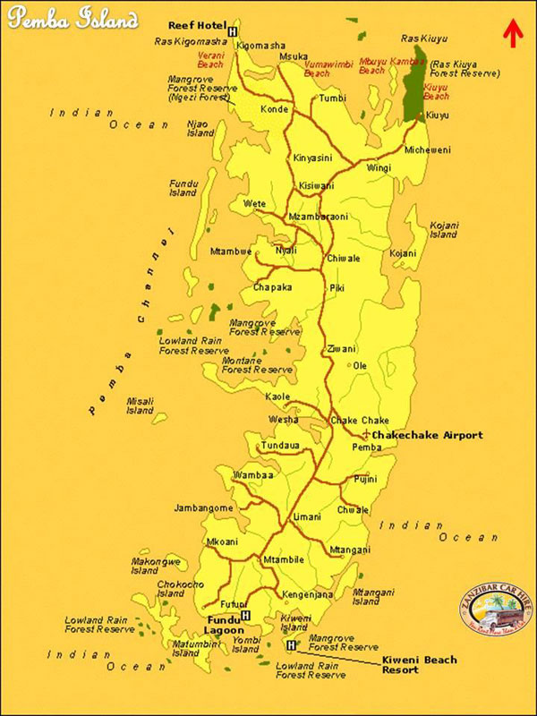 Geography: The two Islands are located in the Indian Ocean about 35km off the coast of mainland Tanzania at longitude 39 degrees East and latitude 6 degrees South of Equator. Pemba is about 40 miles long and 14 miles wide. It has a surface area of 608 square miles (2,332 square kilometers). It is located about 36 miles from the continent and 29 miles north-east of Unguja Island. Unguja Island is 50 miles long and 24 miles wide. It has a surface area of 995 square miles. It is separated from the continent by a 21 mile corridor at its narrowest point. Its highest point is 390 feet above sea level. |